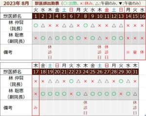 2023年8月の獣医師勤務表