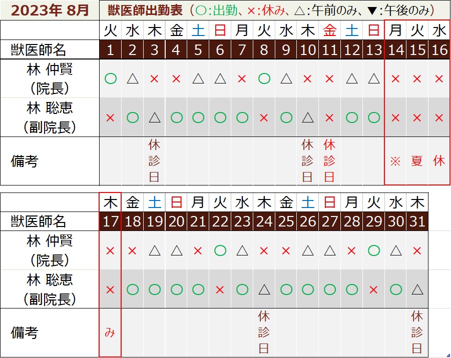2023年8月の獣医師勤務表です。