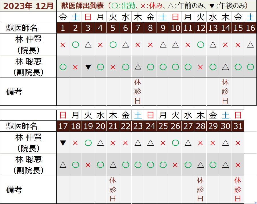 12月2日㈯~3日㈰午前中まで学会参加のため、12月17日㈰午後は勉強会参加のため、副院長は不在となります。