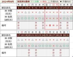 8/9㈮より8/12㈪まで夏休みをいただきますので、前後の休みと合わせて8/8㈭~8/13㈫まで休診となります。