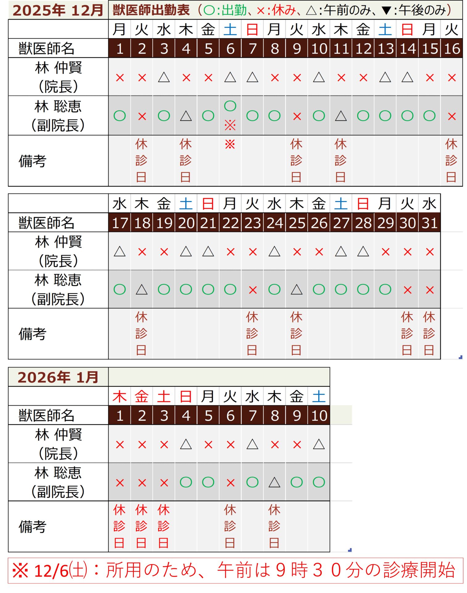2025年12月の獣医師勤務表