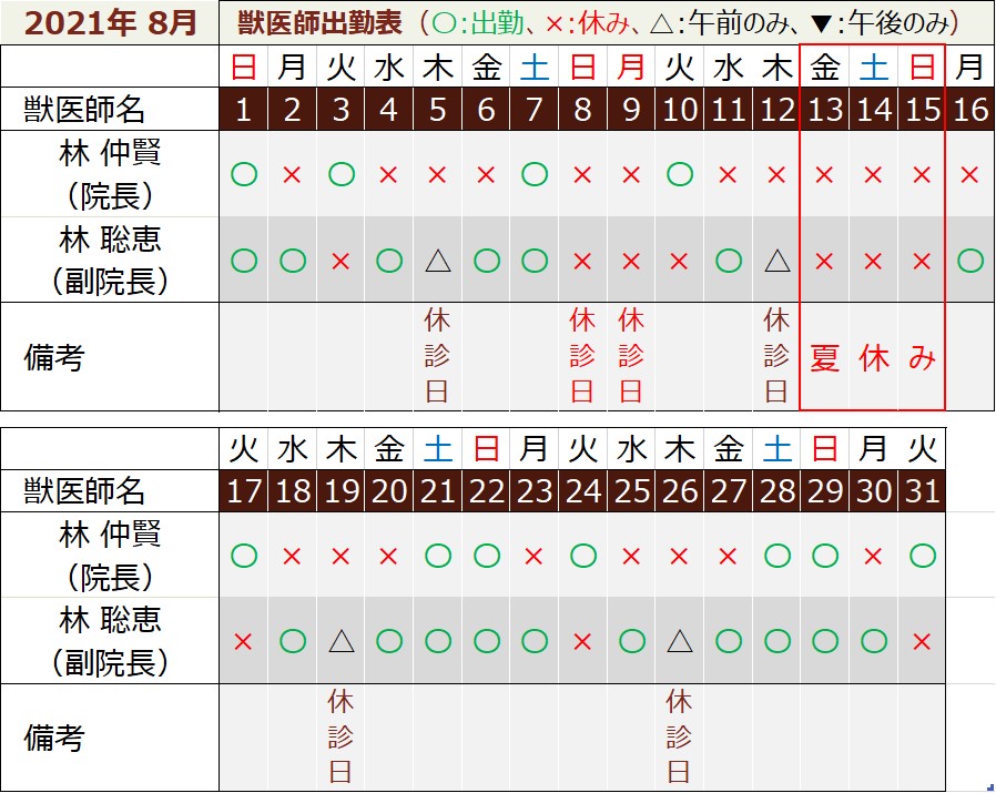 2021年8月の獣医師勤務表|高松市の動物病院をお探しの方は、犬・猫の不妊・去勢をはじめ腫瘍、ヘルニアなど幅広い手術を行える林動物病院まで気軽にご相談ください。土日も診察しております。
